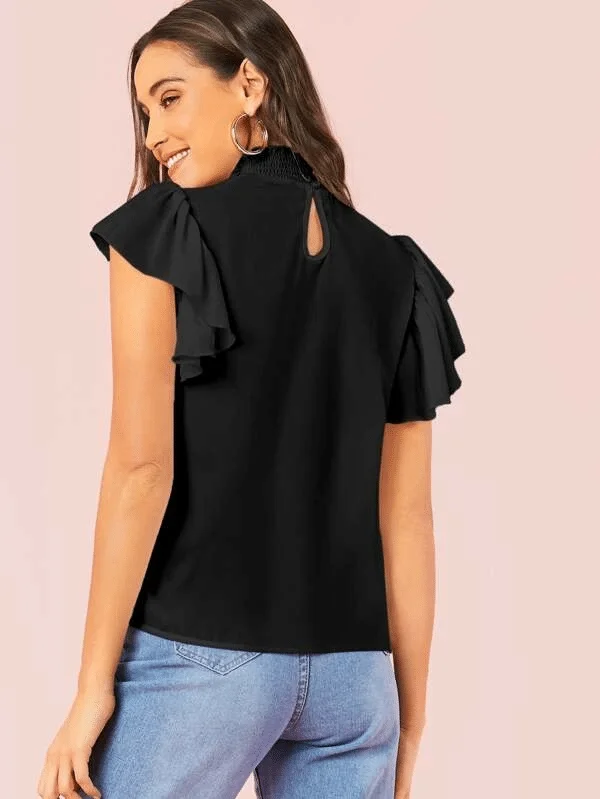 Blusa preta com mangas bufantes gola média